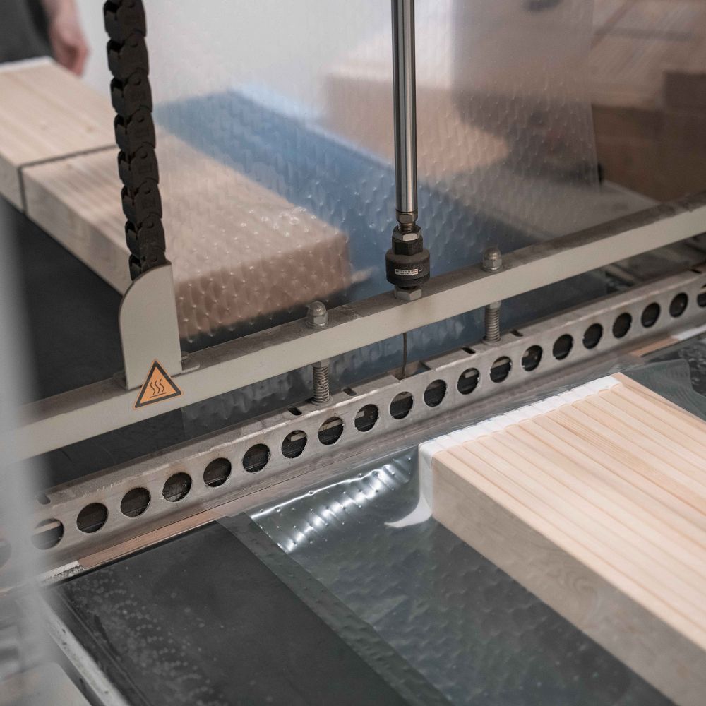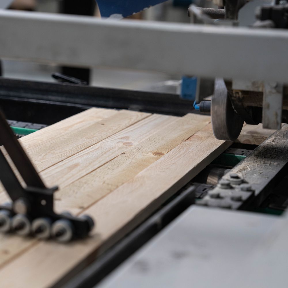 Vi behandler træet omhyggeligt med vores egen træhøvl og skærer det præcist til i individuelle størrelser.
